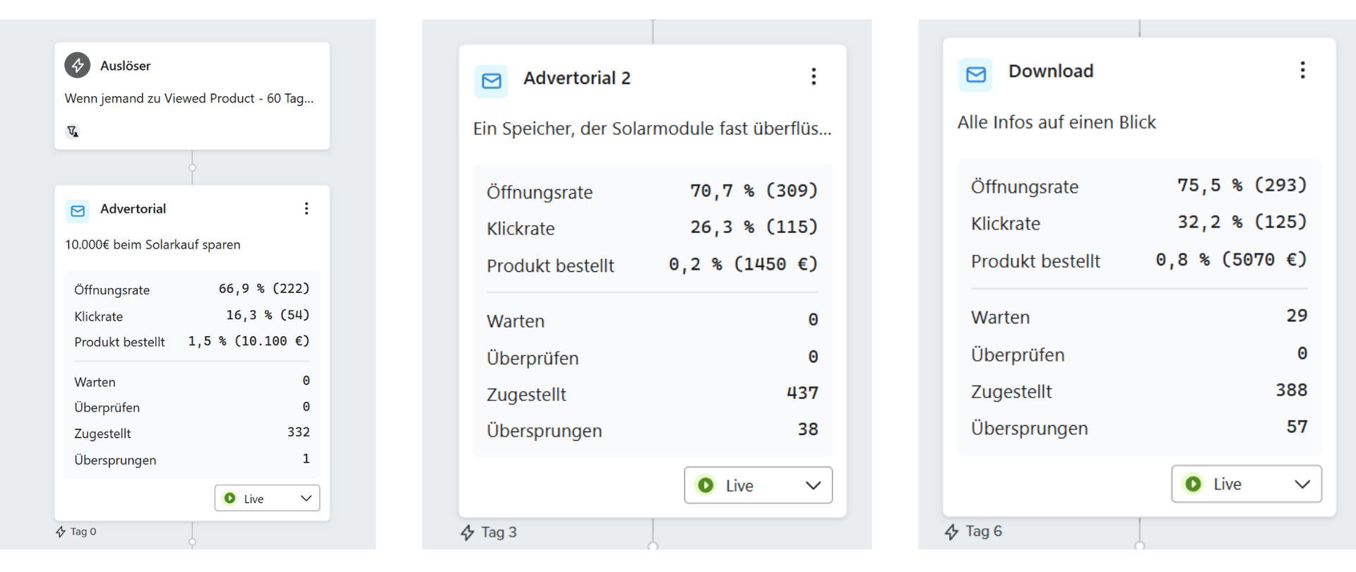 Parallel wurde eine E-Mail-Infrastruktur aufgebaut, die nicht auf Masse, sondern auf Relevanz setzt. Über Exit-Intent-Pop-Ups wurden neue Leads gewonnen, mit Willkommensstrecken, Reaktivierungsflows und edukativen Mails weiterentwickelt – ganz ohne Rabattaktionen. Die Mails griffen häufig Inhalte aus Ads und Landingpages auf und unterstützten Interessenten bei der Kaufentscheidung.