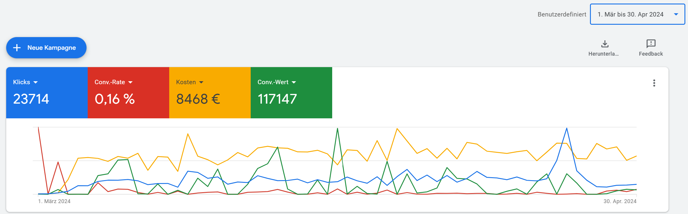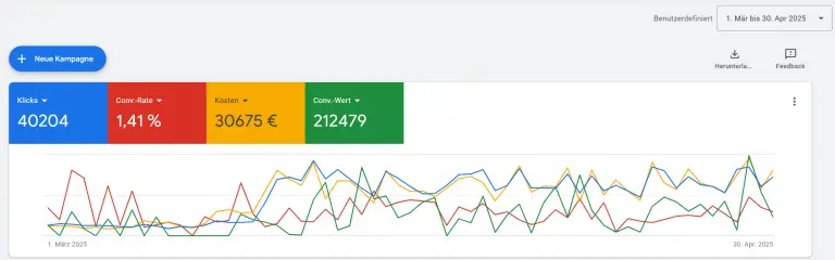 Besonders auffällig: Der Kunde hatte zuvor eng mit einem Google-Berater zusammengearbeitet, der wiederholt empfahl, das Budget für Performance Max Kampagnen zu erhöhen – trotz der hohen Brand-Durchdringung. Im Erstgespräch habe ich diese Strategie infrage gestellt und argumentiert, dass der hohe ROAS keine echten Neukundeneffekte erzeugt. Nach dem Call war der Kunde überzeugt: Es braucht eine neue Struktur, die auf nachhaltige Skalierung statt auf kurzfristige Brand-Ausbeute setzt.